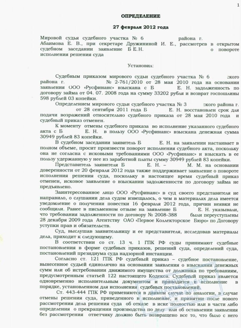 Банк ООО «Русфинанс» удерживал часть заработной платы заемщика Е.Н. в счет погашения ее долга. К моменту обращения Е.Н. к юристу с нее была таким образом взыскана 31.000 руб. (сумма округлена).