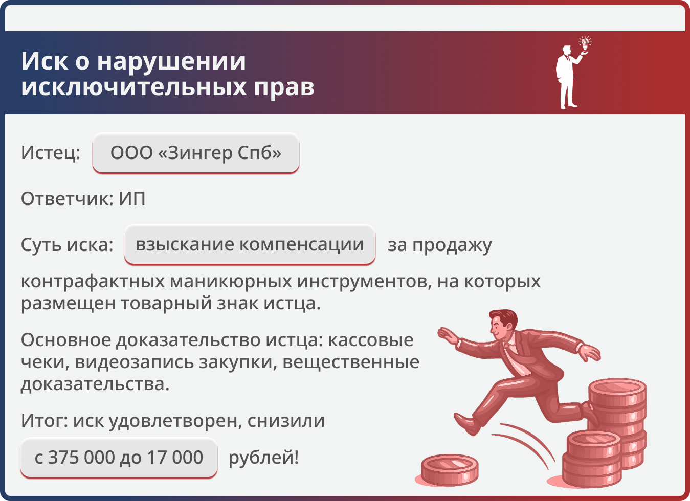 Дело рассматривалось в Арбитражном суде Республики Татарстан в порядке упрощённого производства. Истец зафиксировал две покупки маникюрных инструментов в торговой точке ответчика, совершенные с разницей в две минуты, что подтверждалось чеками и видеозаписью. Изначально сумма иска составляла 50 000 руб., но в ходе разбирательства была увеличена до 375 000 руб. на основании лицензионного договора, заключенного истцом с третьим лицом уже после даты спорной продажи.
