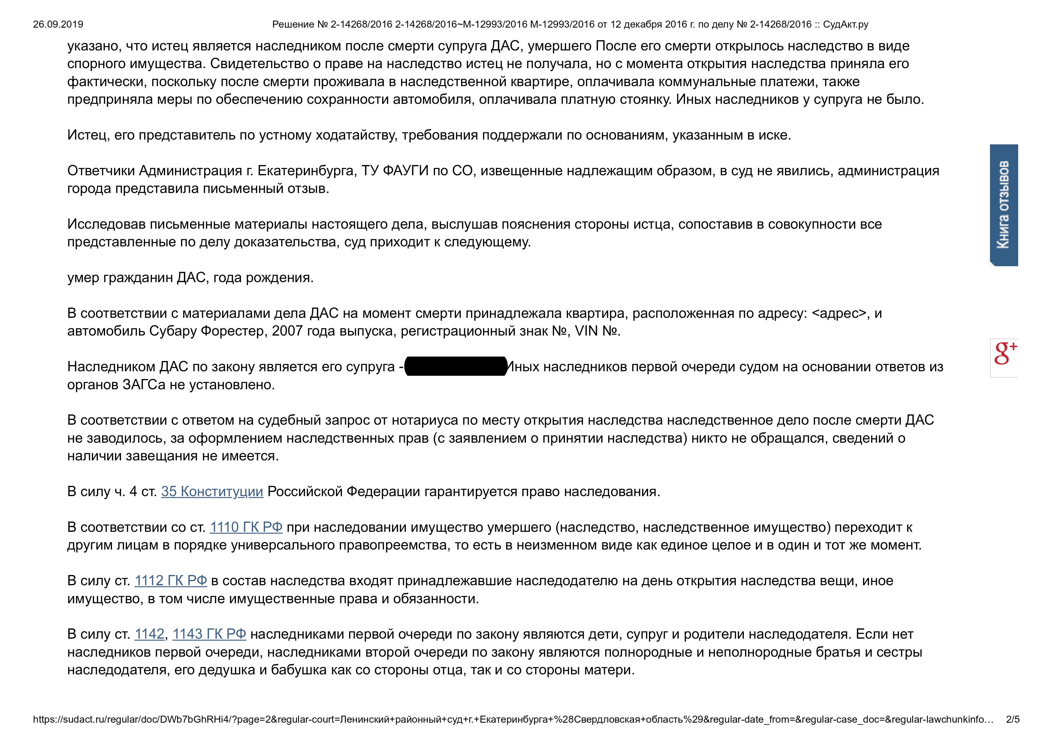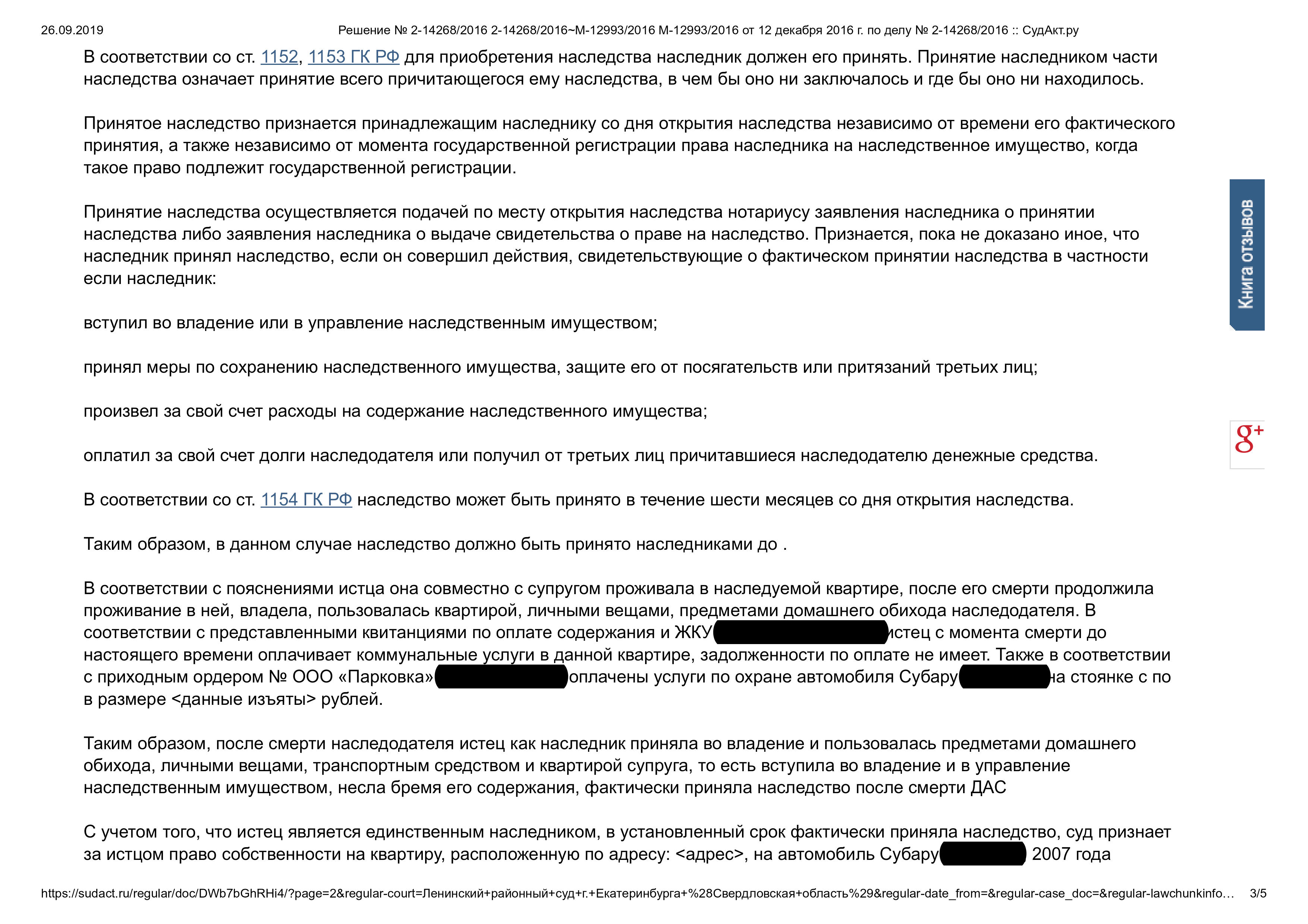 Суд решил: Установить факт принятия нашей клиентки наследства после смерти супруга. Признать право собственности на квартиру, на автомобиль. Исковые требования к Администрации г. Екатеринбурга о признании права собственности в порядке наследования удовлетворить.