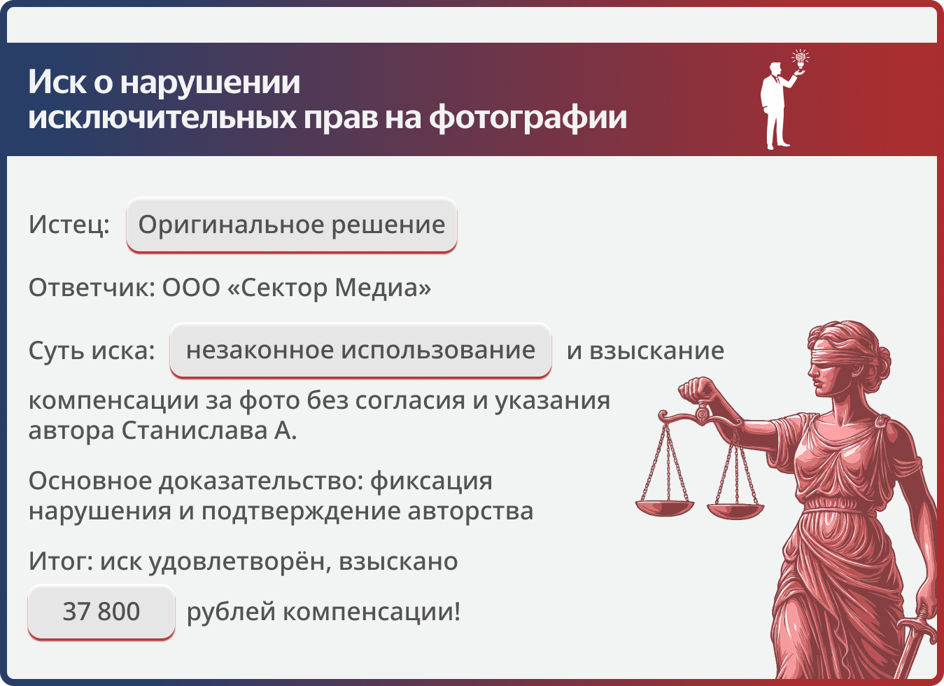 Когда возник вопрос с использованием фотографий без разрешения, Станислав обратился к нам. За юридическое сопровождение отвечал Егоров Андрей: он помог разобраться в ситуации, подготовить правовую позицию и выстроить корректный порядок защиты, чтобы работы автора использовались только на законных условиях.